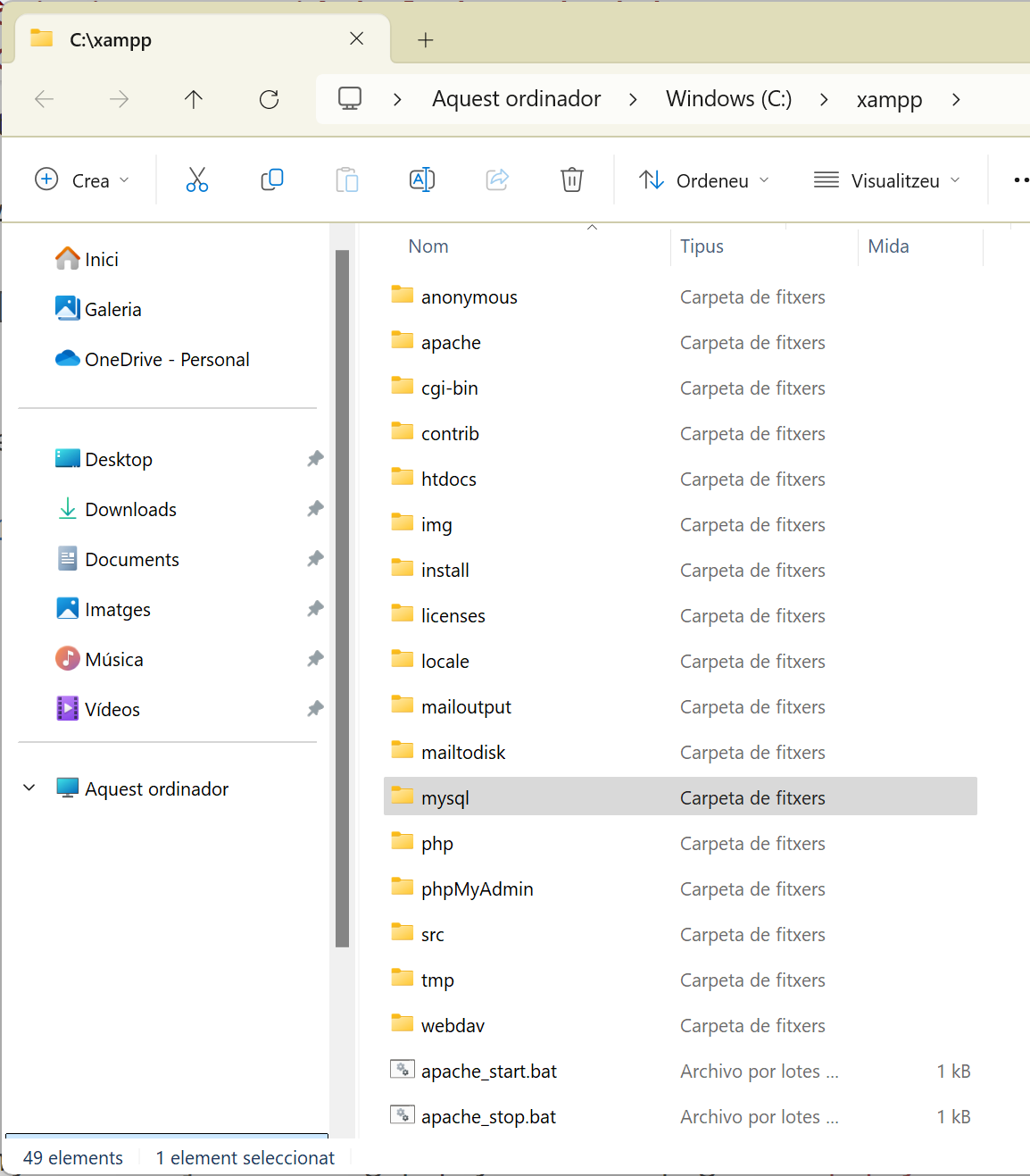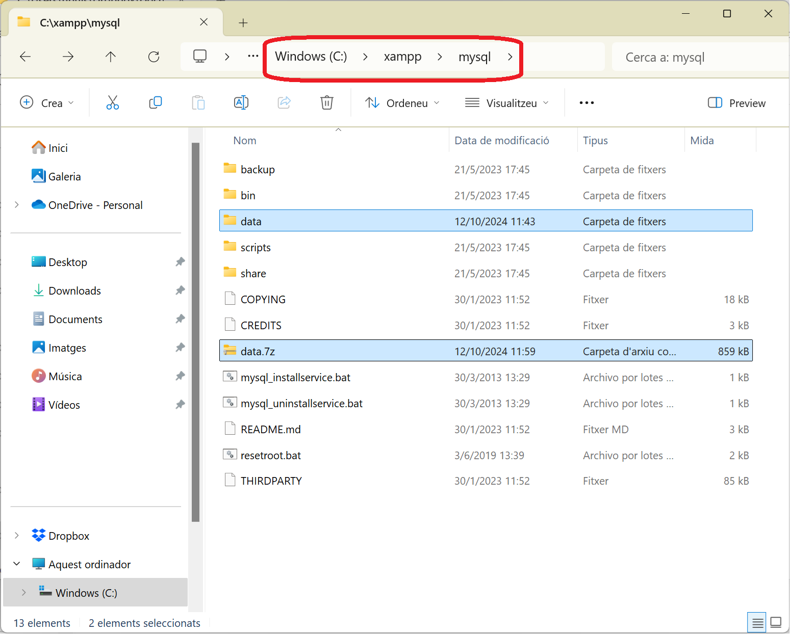Explorerdel xampp-control, obrirem l'explorador de carpetes i anirem a la carpetamysql, que és on tenim la còpia de seguretat, en un fitxer anomenatdata.7zo semblant.Obrim l'explorador de carpetes carpeta mysql