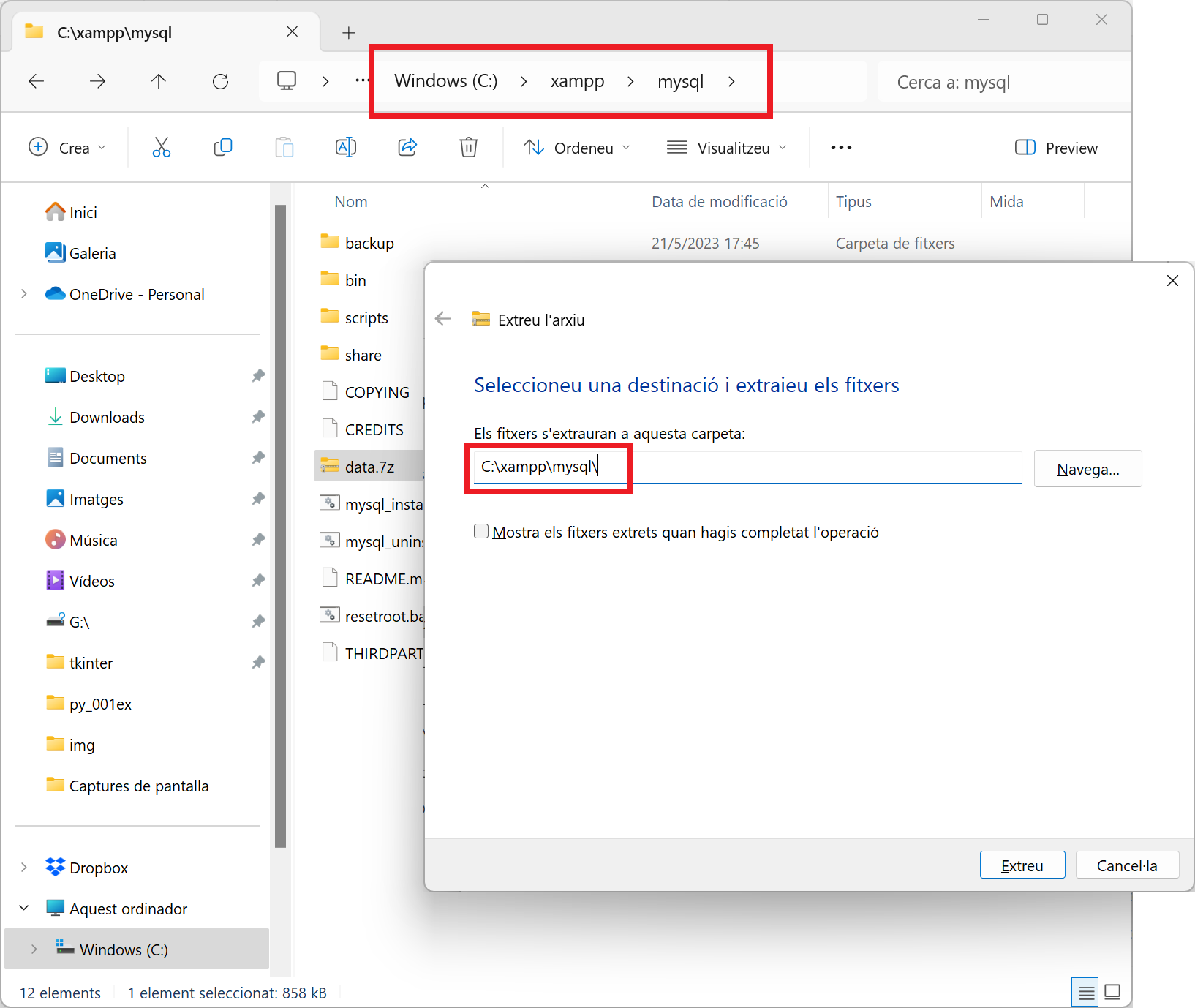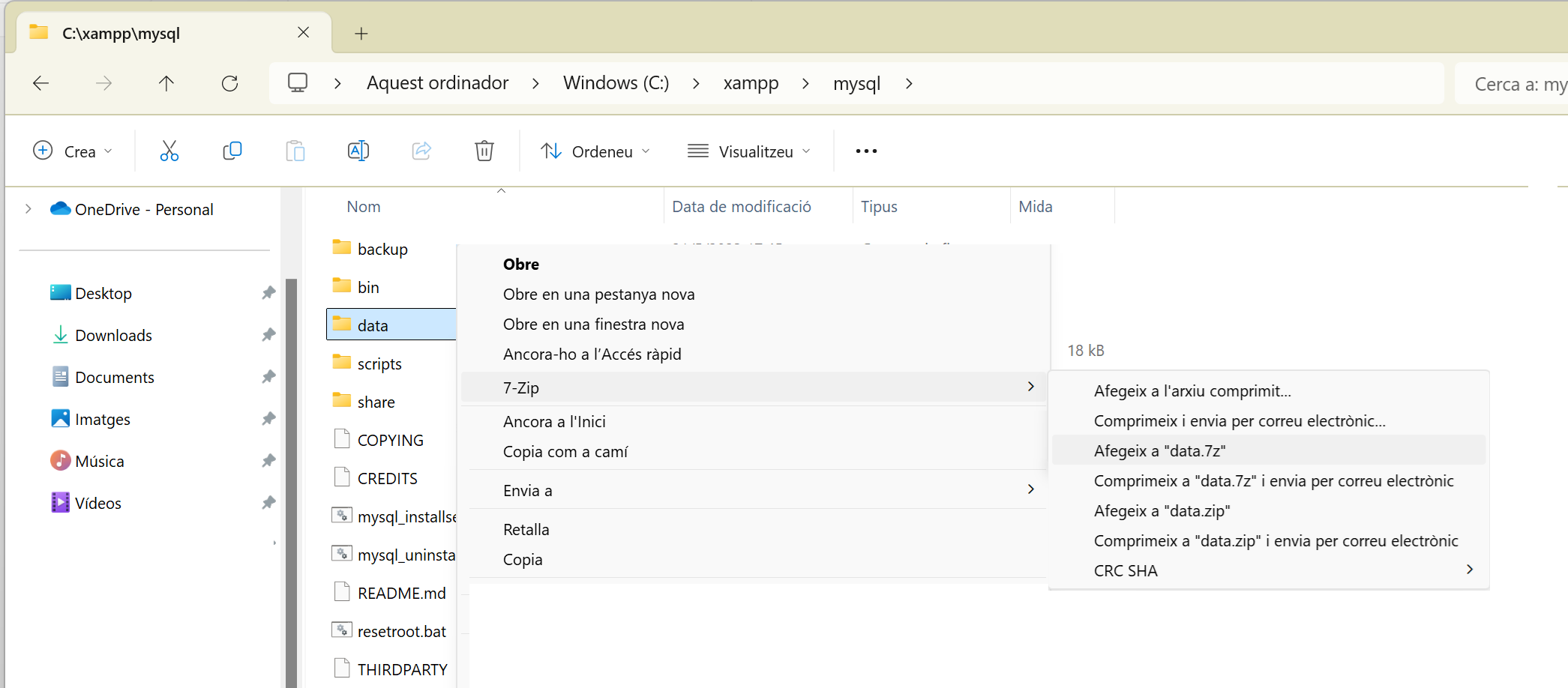 data.7zal mateix directorimysqlCal descomprimir el fitxer al directori mysql, no al data