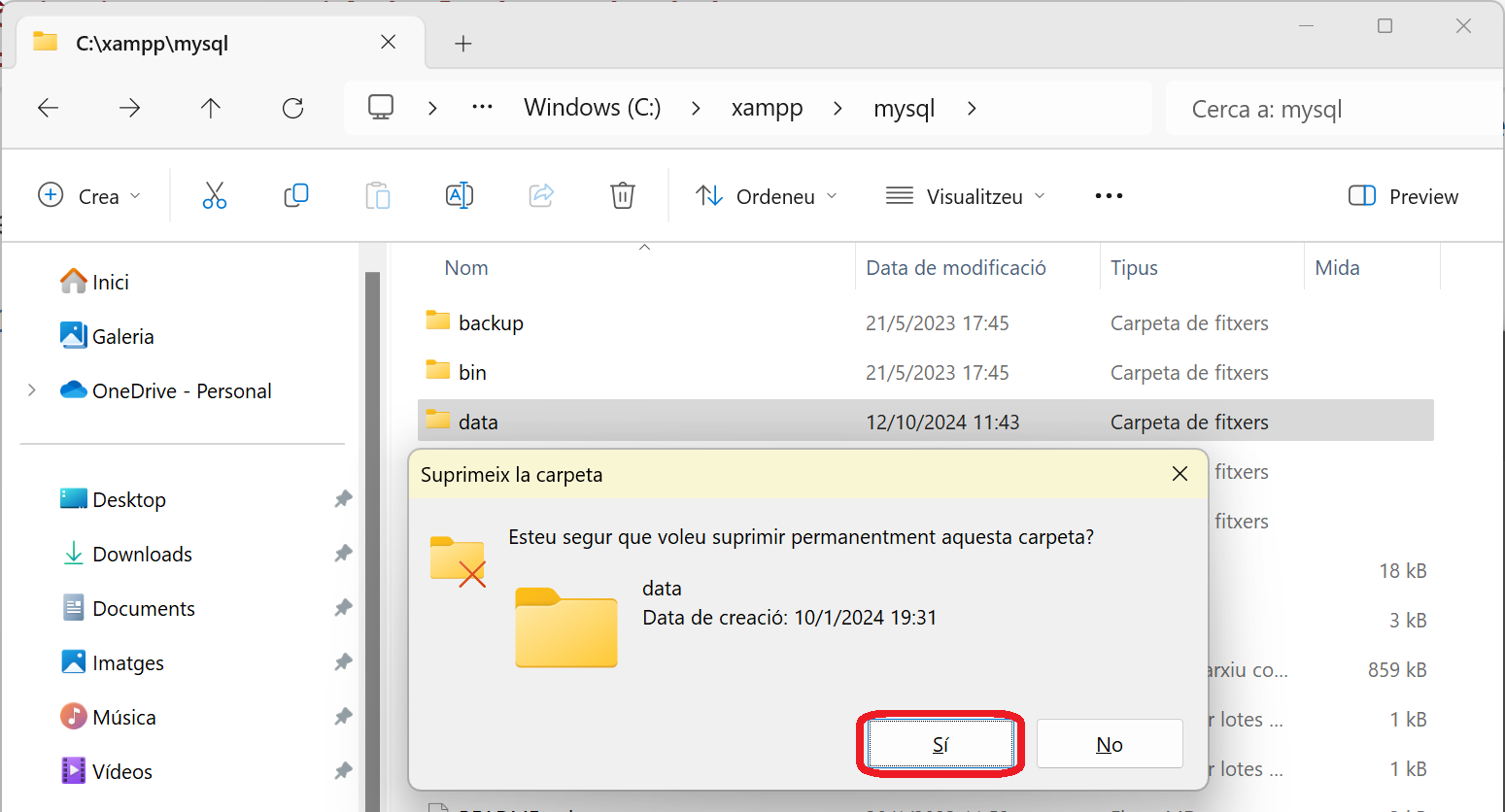 rmdirper eliminar les dades incorrectesComanda que executem des de la shellrmdir /s /q mysql\datai executem la comanda