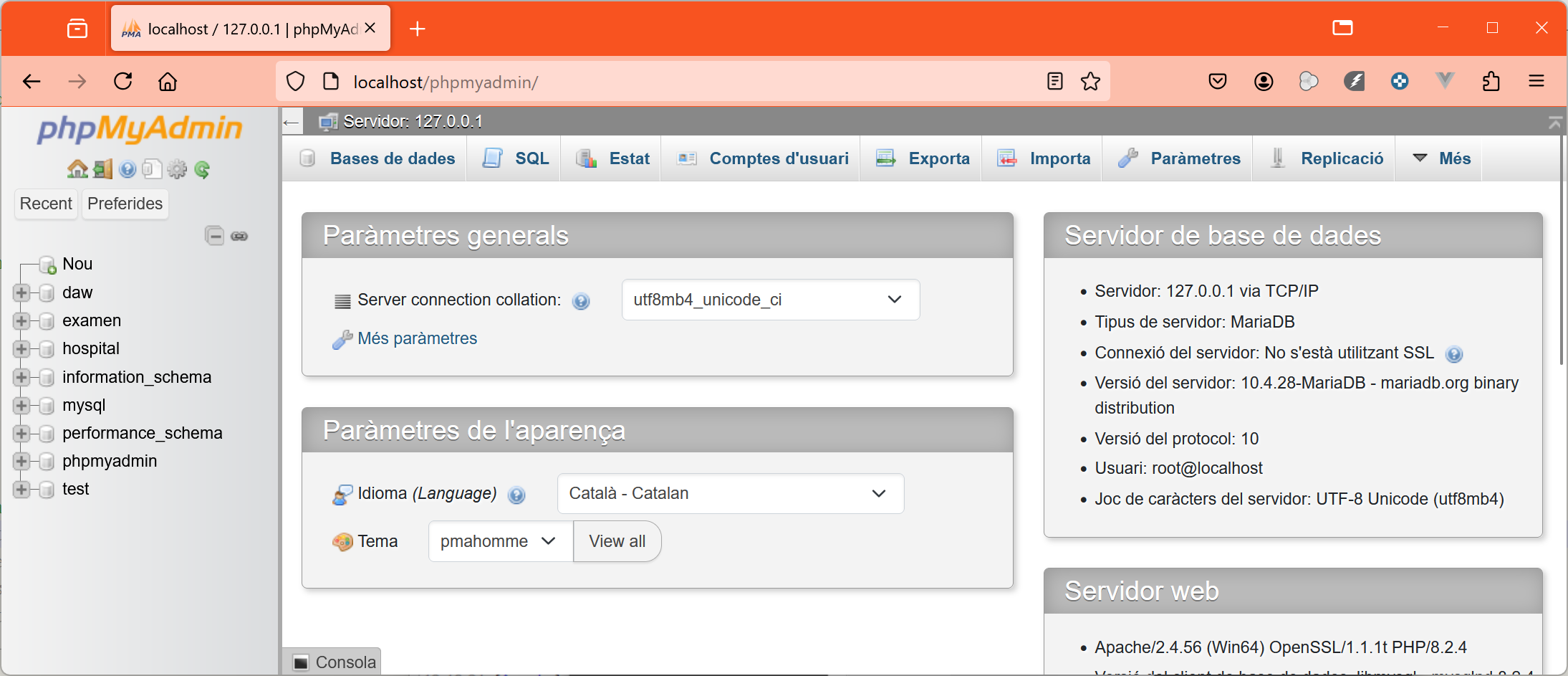 empresa.countries OK empresa.departments OK empresa.employees OK empresa.job_grades OK empresa.job_history OK empresa.jobs OK empresa.locations OK empresa.regions OK hospital.dept OK hospital.doctor OK hospital.empl OK hospital.hospital OK hospital.malalt OK hospital.plantilla OK hospital.sala OK mysql.column_stats OK mysql.columns_priv error : Bitmap at page 0 has pages reserved outside of data file length error : Corrupt mysql.db warning : Size of datafile is: 2162688 Expected: 16384 status : OK mysql.event OK mysql.func OK mysql.global_priv OK mysql.gtid_slave_pos OK mysql.help_category OK mysql.help_keyword OK mysql.help_relation OK mysql.help_topic OK mysql.index_stats OK mysql.innodb_index_stats OK mysql.innodb_table_stats OK mysql.plugin OK mysql.proc OK mysql.procs_priv OK mysql.proxies_priv warning : Size of datafile is: 17065 Expected: 16384 status : OK mysql.roles_mapping warning : Size of datafile is: 9933 Expected: 8192 status : OK mysql.servers OK mysql.table_stats OK mysql.tables_priv OK mysql.time_zone OK mysql.time_zone_leap_second OK mysql.time_zone_name OK mysql.time_zone_transition OK mysql.time_zone_transition_type OK mysql.transaction_registry OK phpmyadmin.pma__bookmark OK phpmyadmin.pma__central_columns OK phpmyadmin.pma__column_info OK phpmyadmin.pma__designer_settings OK phpmyadmin.pma__export_templates OK phpmyadmin.pma__favorite OK phpmyadmin.pma__history OK phpmyadmin.pma__navigationhiding OK phpmyadmin.pma__pdf_pages OK phpmyadmin.pma__recent OK phpmyadmin.pma__relation OK phpmyadmin.pma__savedsearches OK phpmyadmin.pma__table_coords OK phpmyadmin.pma__table_info OK phpmyadmin.pma__table_uiprefs OK phpmyadmin.pma__tracking OK phpmyadmin.pma__userconfig OK phpmyadmin.pma__usergroups OK phpmyadmin.pma__users OK Repairing tables mysql.columns_priv error : aria_sort_buffer_size is too small. Current aria_sort_buffer_size: 16384 rows: 234 sort_length: 1006 error : Create index by sort failed info : Retrying repair with keycache status : OKEn el cas en què la comanda trobi i arregli algun error, tornarem a executar-la per tal d'assegurar-nos que la base de dades és correcta.