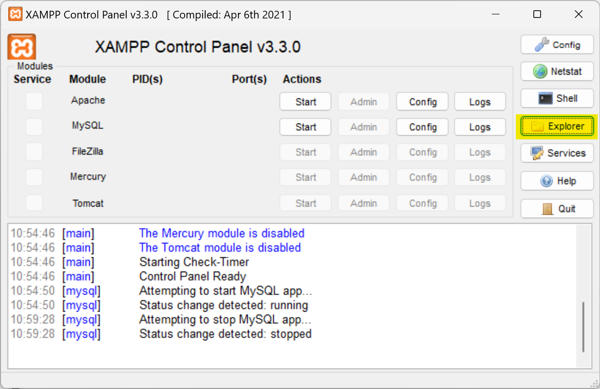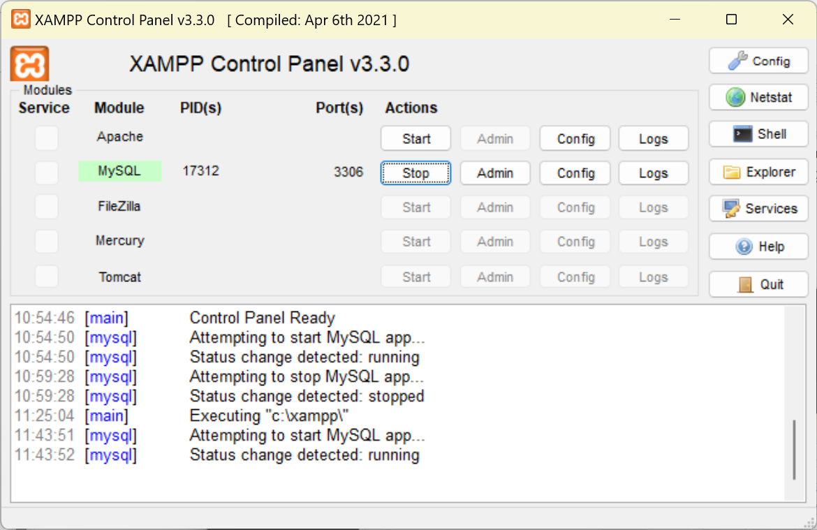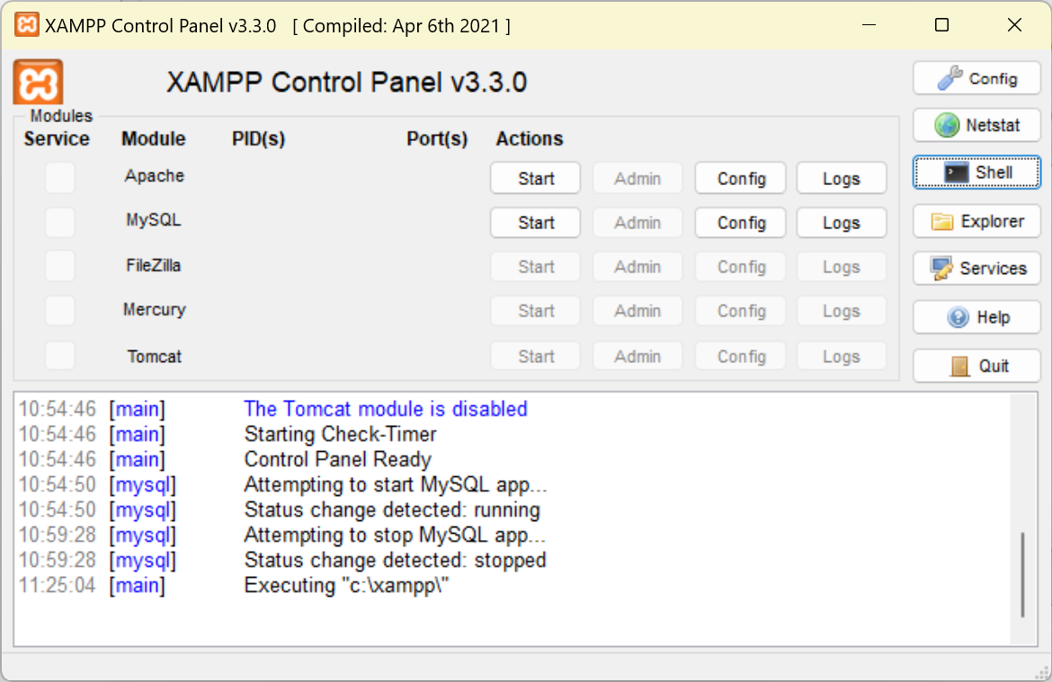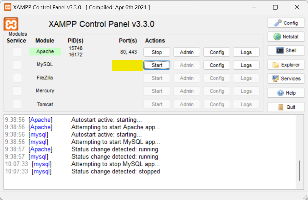 Obrim una shell des del xampp-control i analitzem i restaurem tot el que calgui.