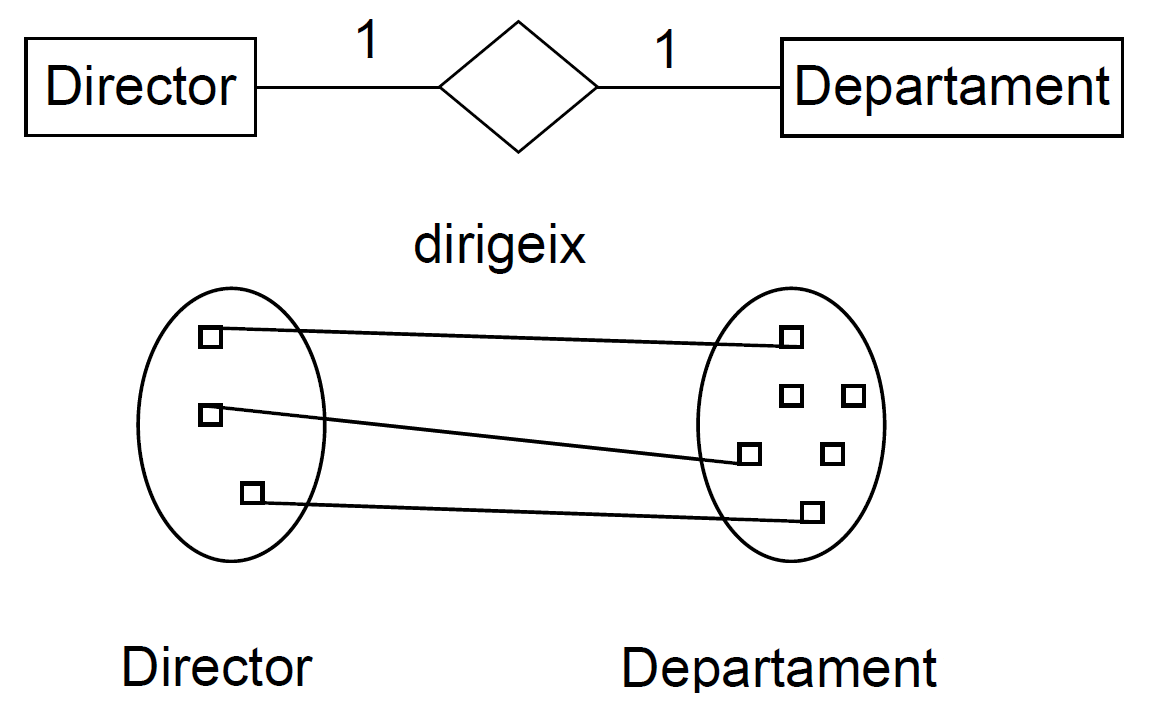 - Exemple: un departament només pot tenir un director i aquest només pot ser-ho d'un sol departament.
