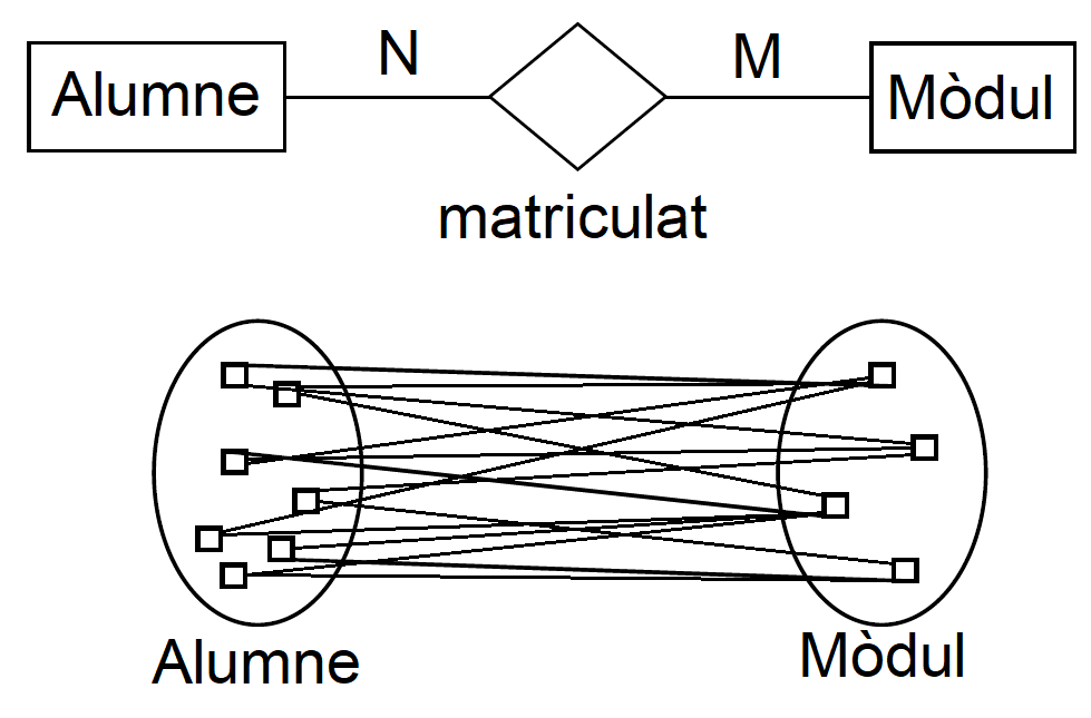 - Exemple: un alumne està matriculat a diversos mòduls i un mòdul té molts alumnes matriculats.