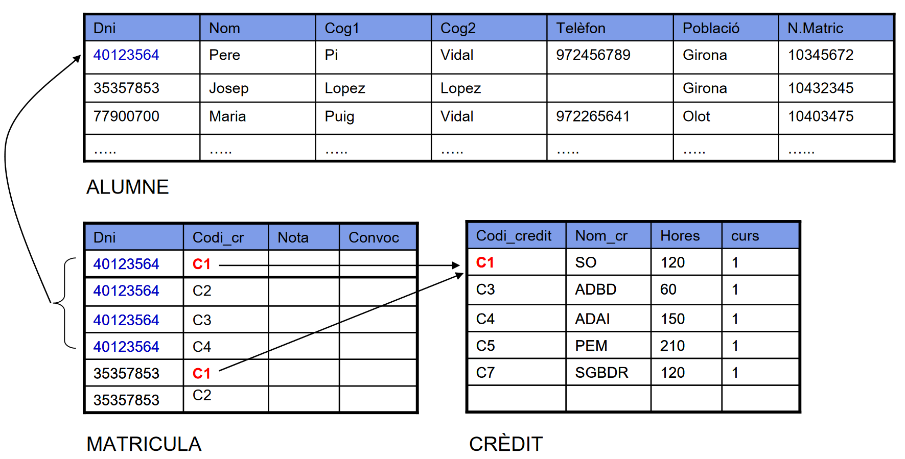 ALUMNE(Dni, Nom, Cog1, Cog2, Telèfon, Població, N.Matrícula)