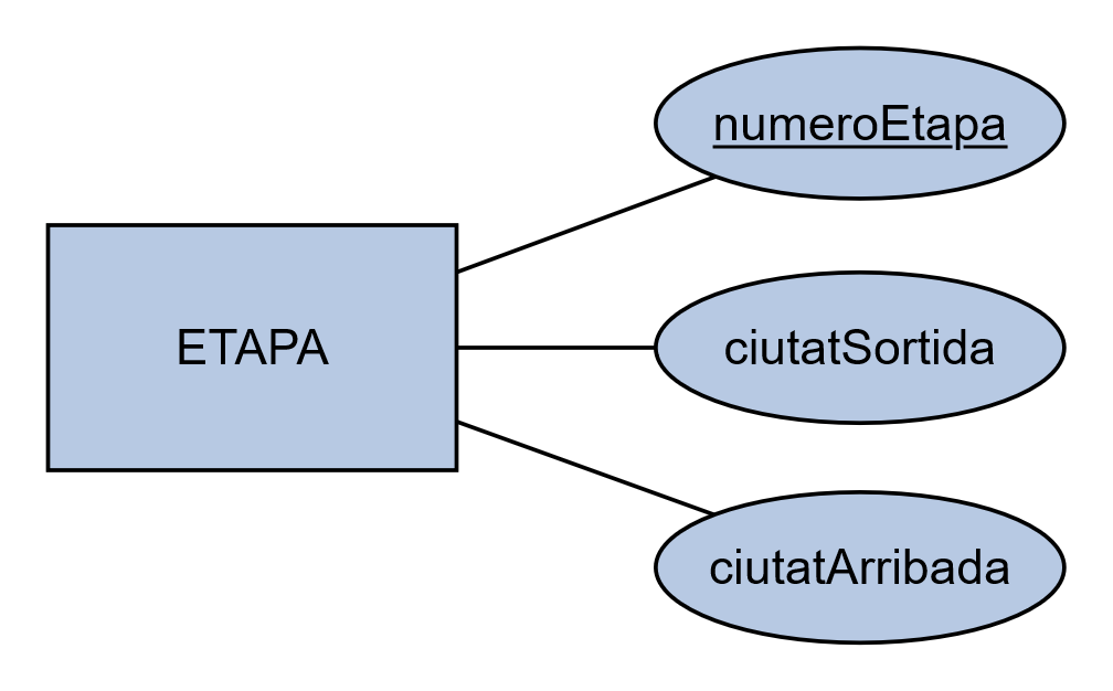 ETAPA ( numeroEtapa, ciutatSortida, ciutatArribada )
