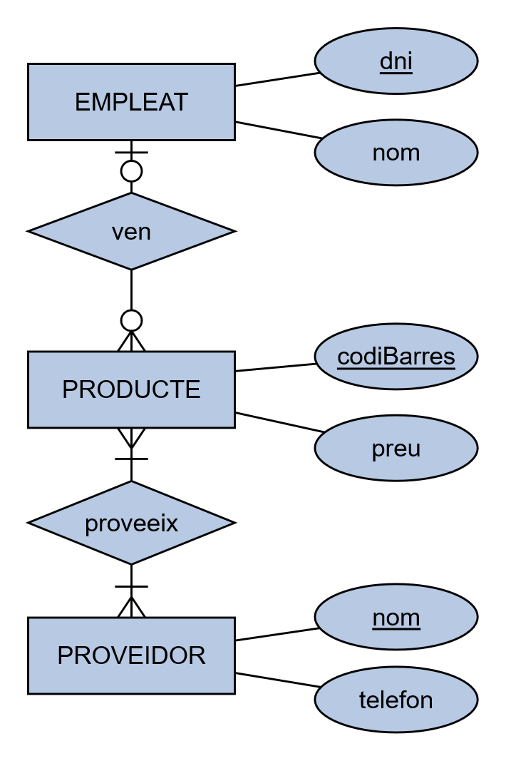 PRODUCTE ( codiBarres, preu, dniVenedor )
