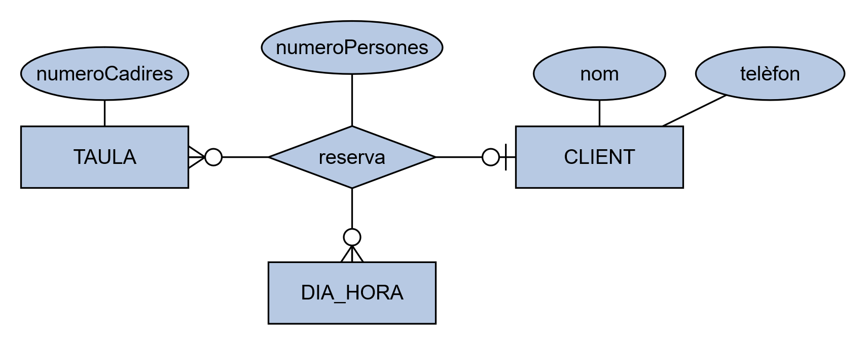 RESERVA ( codiTaula, codiClient, dia, hora, numeroPersones )