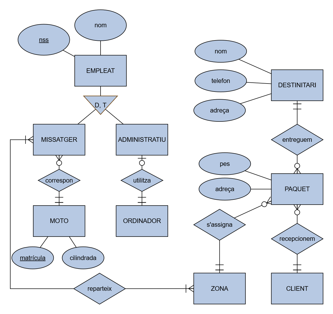 Donat el model ER següent, feu-ne la traducció al model relacional, suposant que totes les entitats del diagrama tenen com a mínim un codi i una descripció: