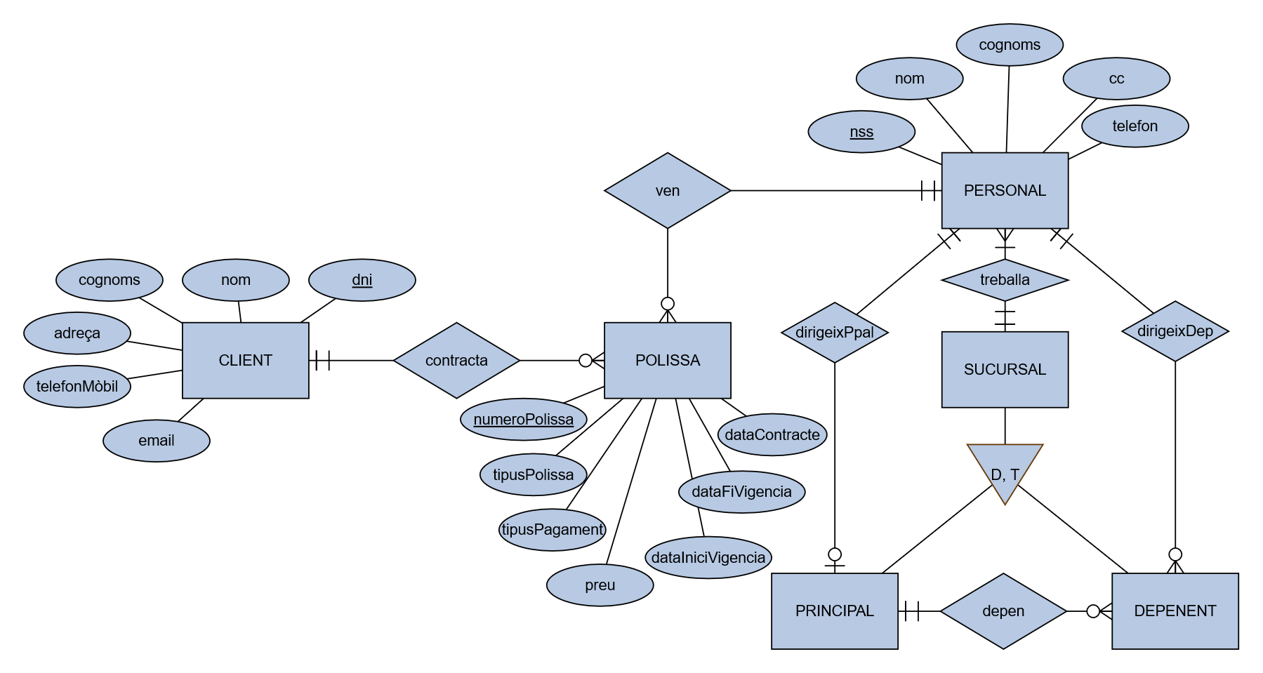 POLISSA ( numeroPolissa, tipusPolissa, tipusPagament, preu, dataIniciVigència, dataFiVigència, dataContracte, dni, nss )