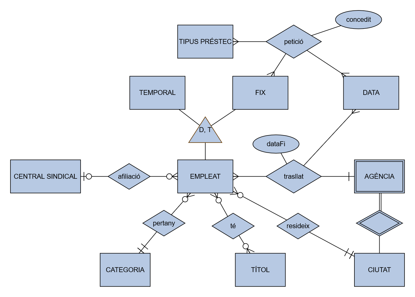 Donat el diagrama ER següent, feu-ne la traducció al model relacional, suposant que totes les entitats del diagrama tenen com a mínim un atribut clau i altres atributs significatius que pugeu inventar-vos: