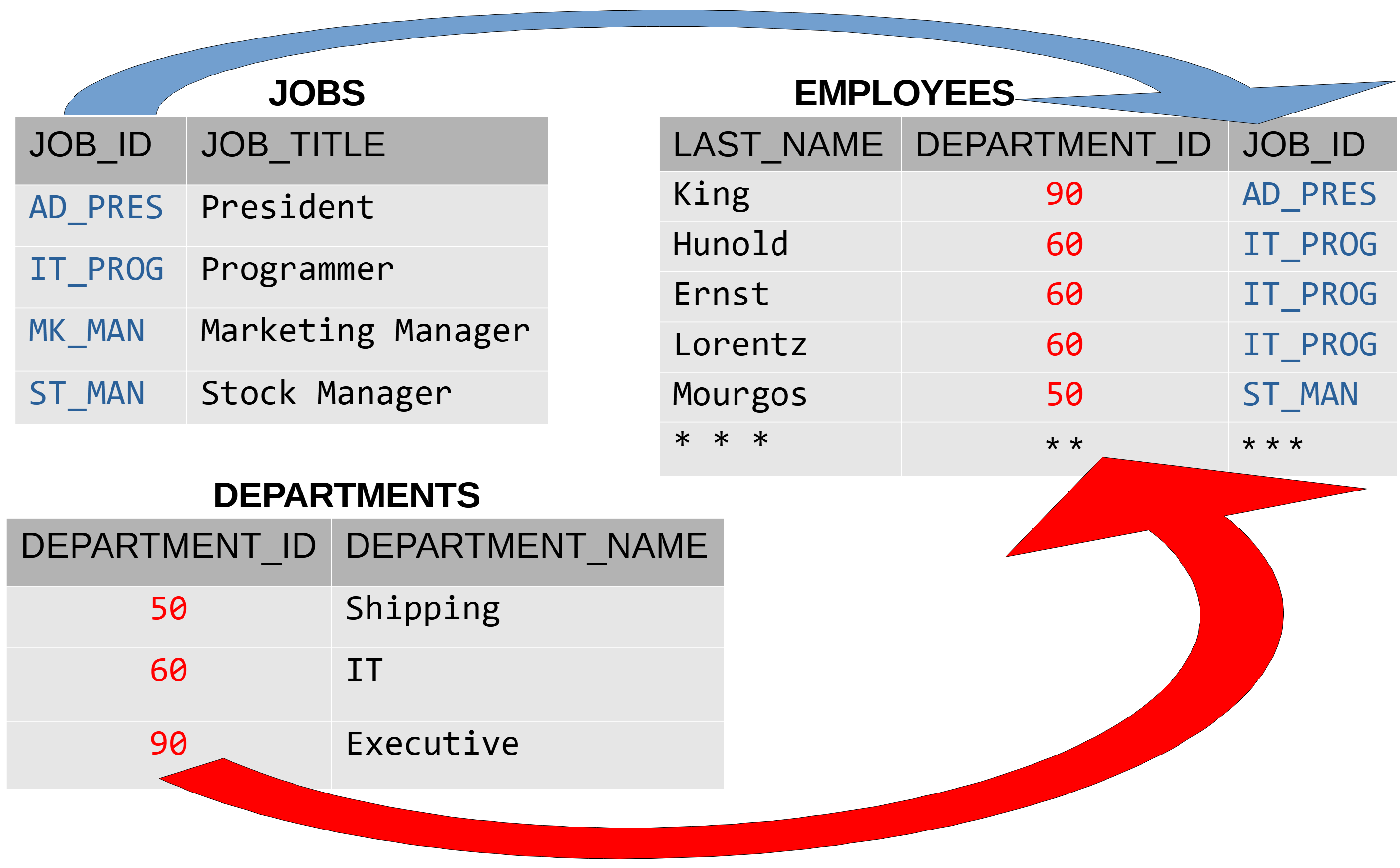 La consulta ha enllaçat les files de les taules EMPLOYEES i JOBS on EMPLOYEES.JOB_ID = JOBS.JOB_ID