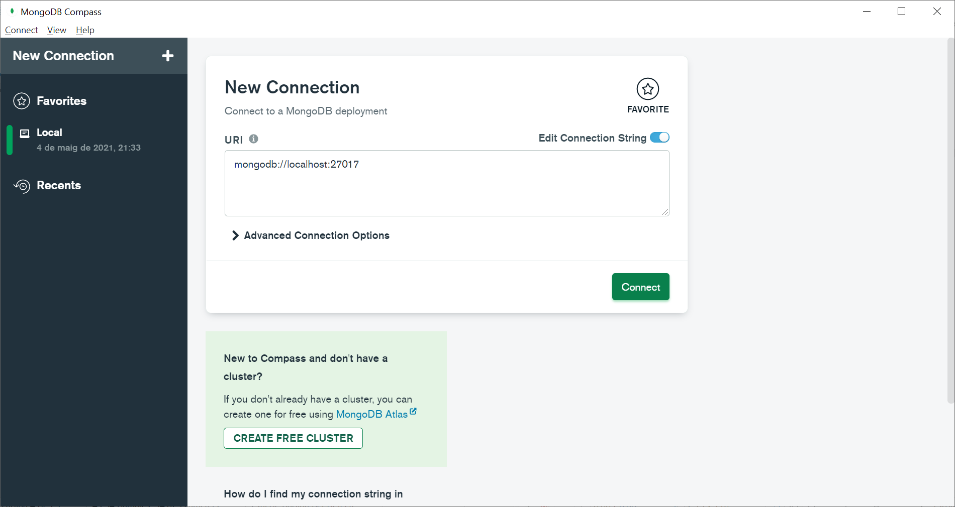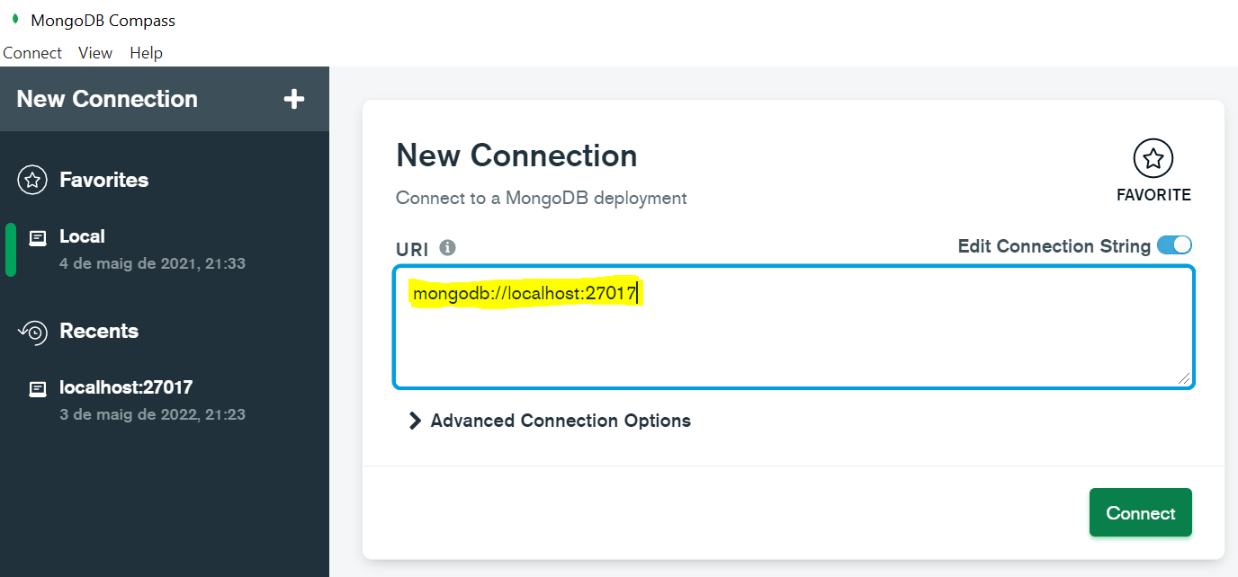 Des de l’eina MongoDBCompass podem connectar-nos utilitzant la connexió (indicant o no el port)