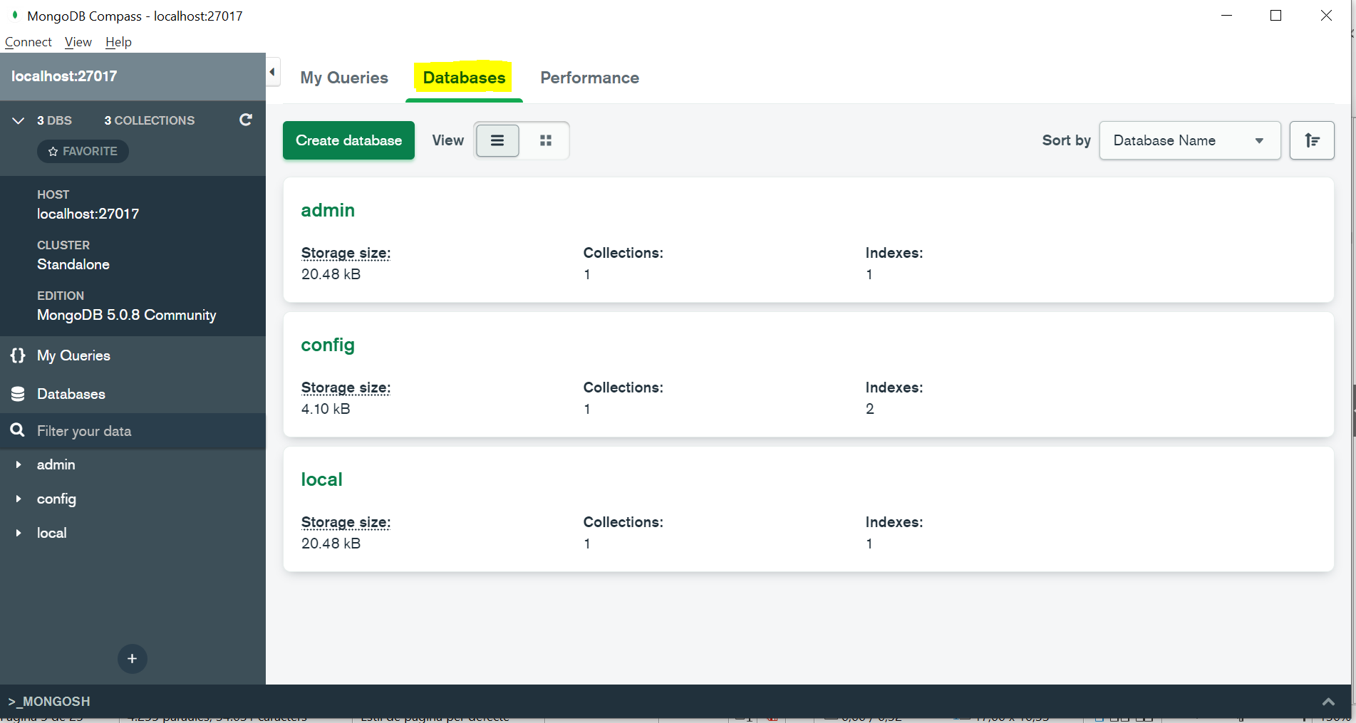 Ara tenim un servidor de MongoDB executant i escoltant pel port per defecte 27017.