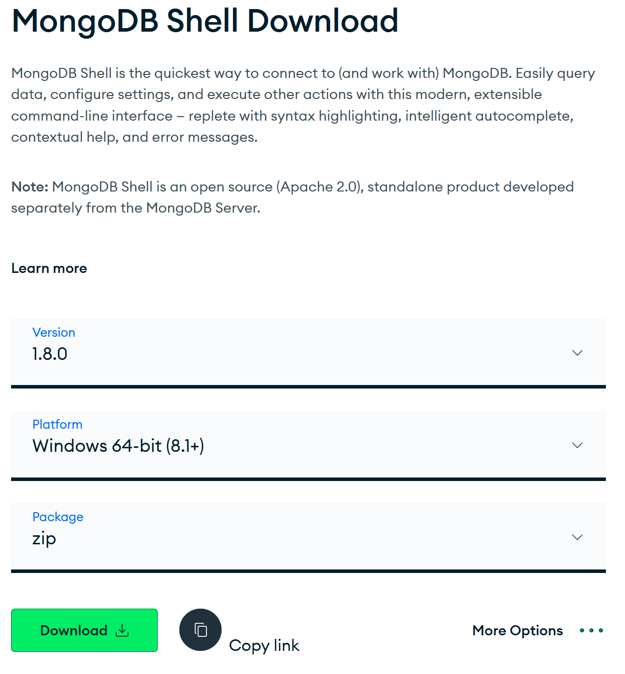 A partir de la versió 6, la versió client de shell per MongoDB cal descarregar-la a part i instal·lar-la. Per això, anirem a la pàgina de descàrrega del MongoShell i descarregarem el fitxer d'instal·lació. Accés a la descàrrega de Mongo Shell
