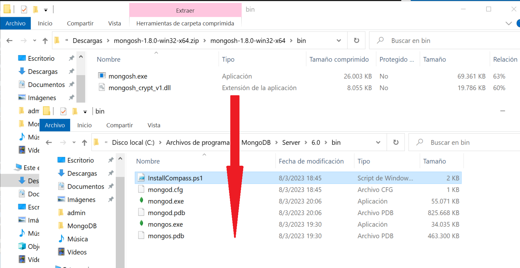 El més senzill és descomprimir els fitxers del directori bin, del fitxer descarregat, al directori d'instal·lació del mongoDB. Per tant copiarem el fitxer mongosh.exe i el fitxer mongosh_crypt_v1.dll al directori "C:\Program Files\MongoDB\Server\6.0\bin\"