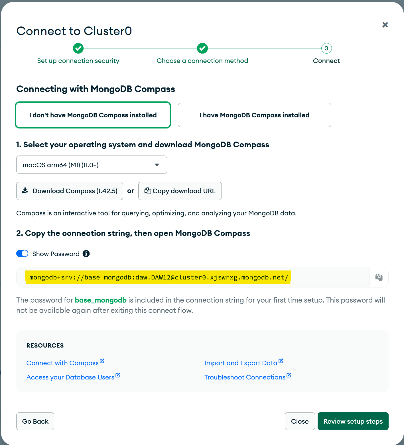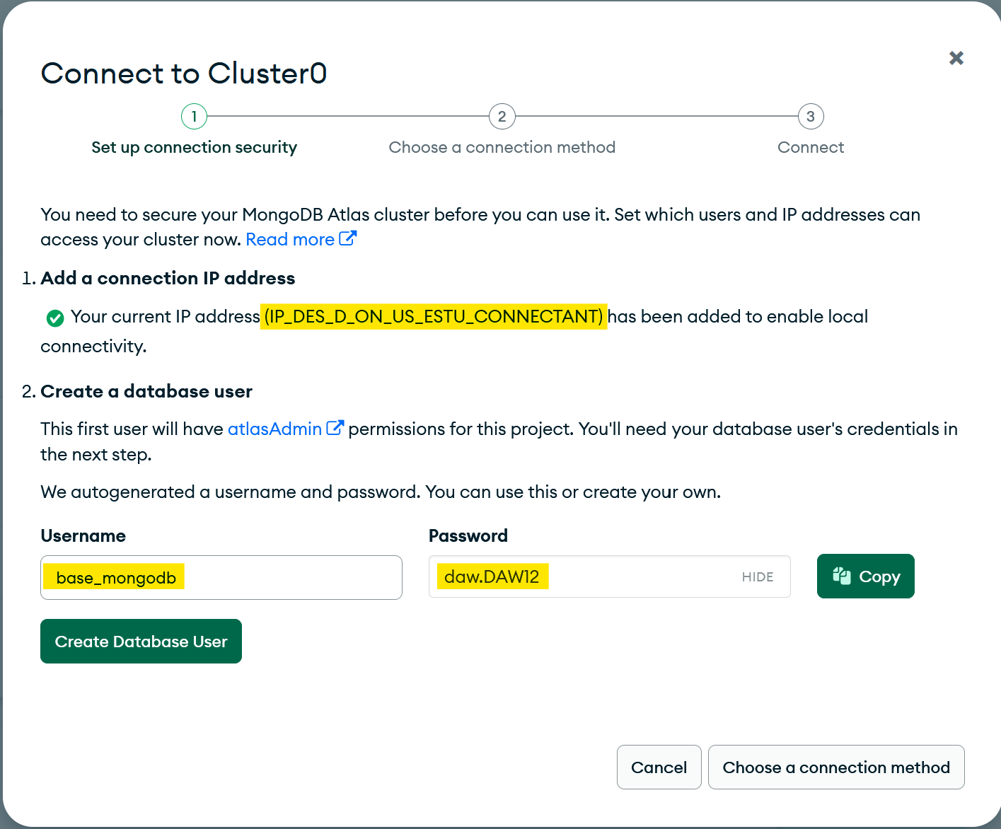 Clicarem Create DataBase User i tot seguit escollirem el mètode de connexió. Per nosaltes serà Compass
