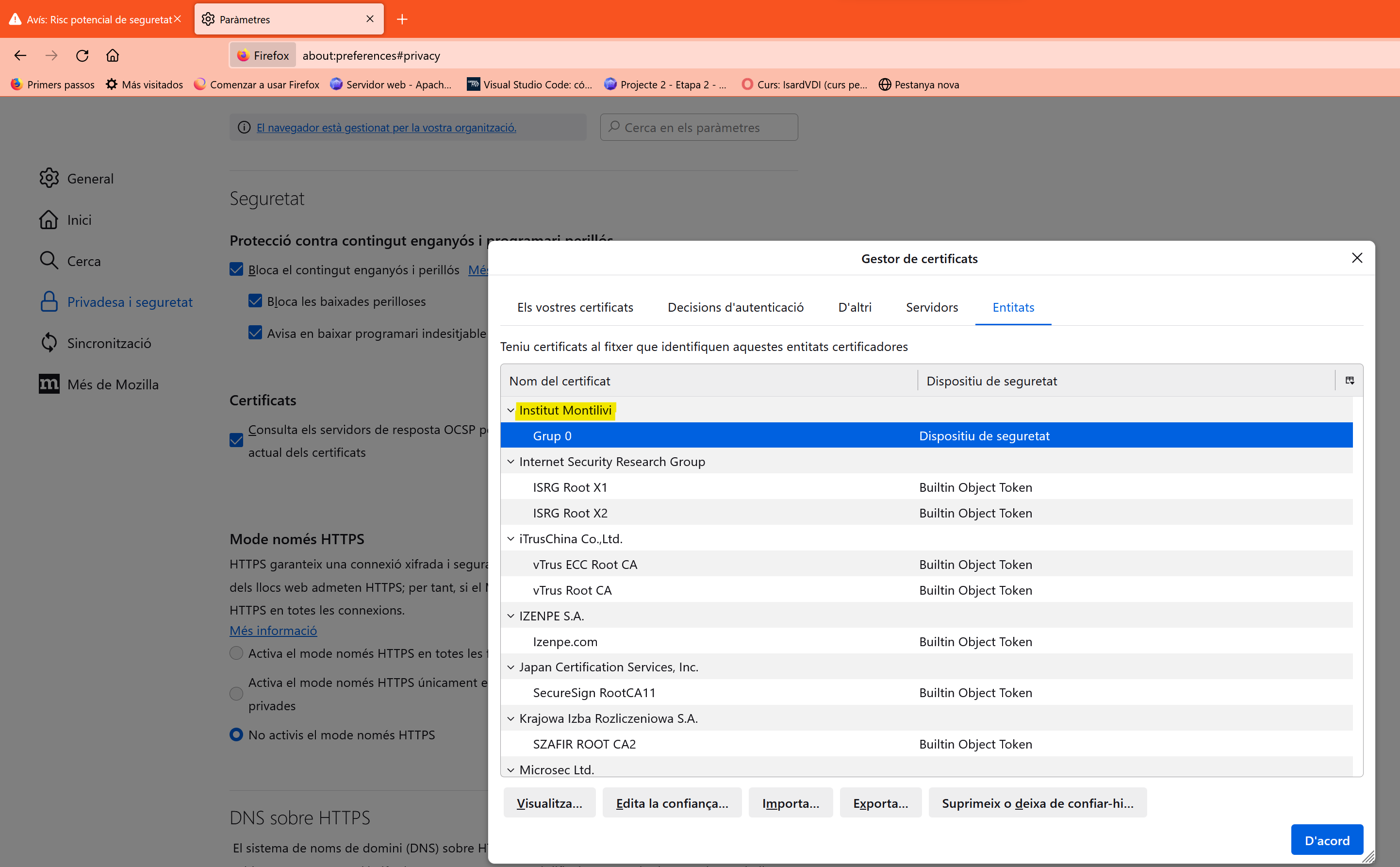 Si feu la prova amb el navegador, igualment us donarà un avís de seguretat. Això és perquè el nostre navegador no coneix la CA, i per tant no li dona validesa. Caldrà doncs dir-li al firefox que confiï en aquesta CA. Per això caldrà que aneu als paràmetres el Firefox a la part de privadesa i aneu a l'apartat de Certificats. Hi hauria d'haver un botó que digui Gestor de certificats o Mostra els certificats. Hi aneu i busqueu la pestanya de les Entitats. Aquí caldrà afegir el certificat (no la clau) de la CA creada anteriorment i donar-li confiança.